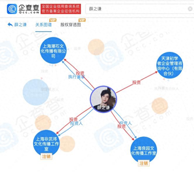 企查查APP显示,薛之谦直接对外投资企业4家,2家为存续状态,包含上海潮石文化传播有限公司等,间接对外投资企业超40家,33家为存续状态,间接持股比例不到5%。