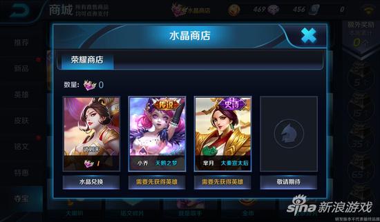 水晶商店中将会有大量稀有的英雄和皮肤,已经在夺宝中下架的武则天就可以在水晶商店中兑换到哦,兑换武则天需要花费1个荣耀水晶哦