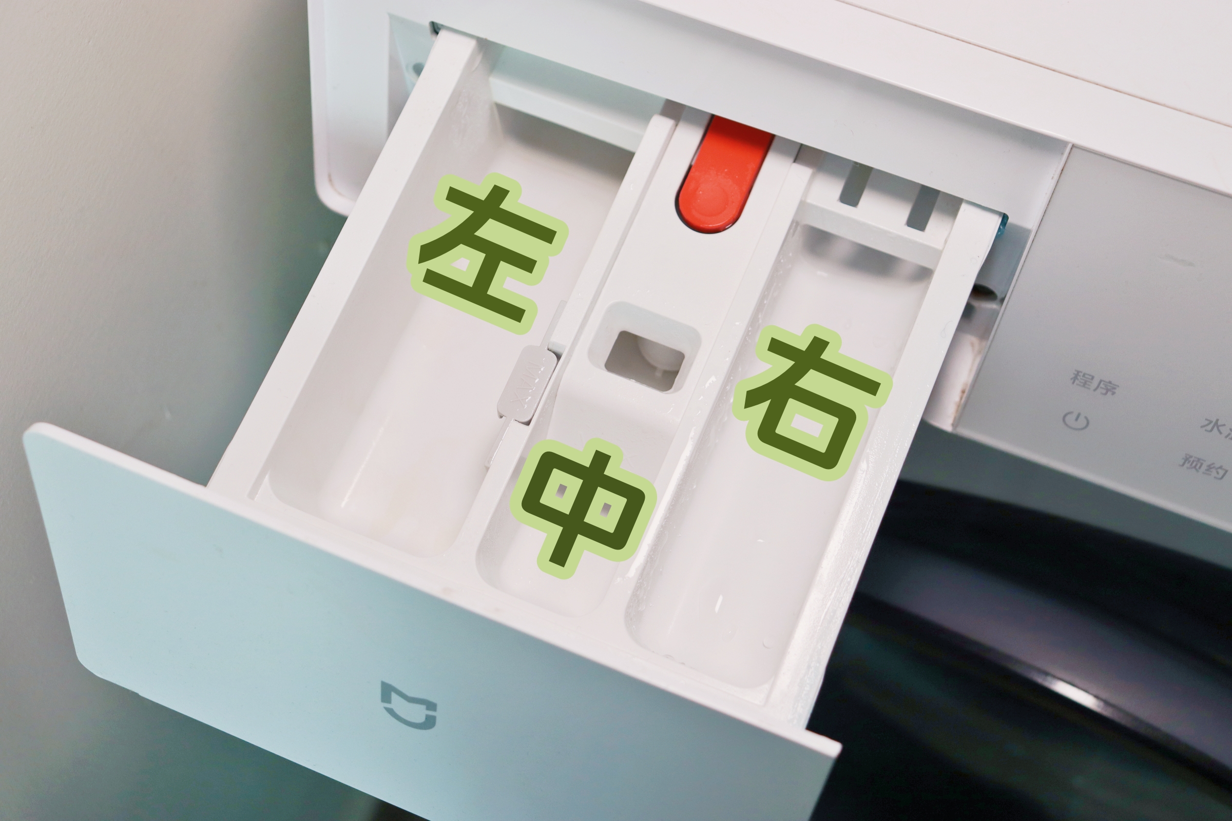 •最左边那个格子,是用来倒洗衣液或者洗衣粉的。洗衣机工作时,水会第一时间涌入这个格子,把洗衣液带进洗衣机里。