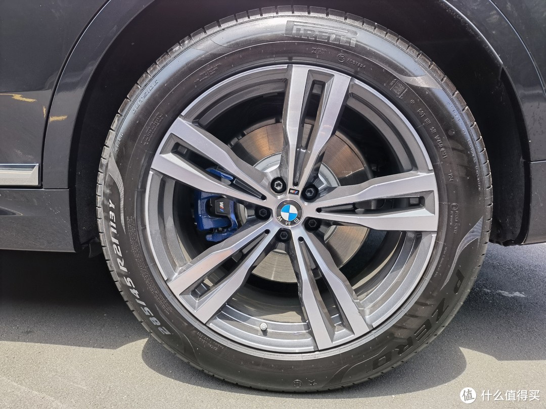 对于x7来说21寸轮毂不算大,还是应该22-23寸比较合适。285/45/R21,以后换胎不便宜。Brembo代工蓝色M卡钳。