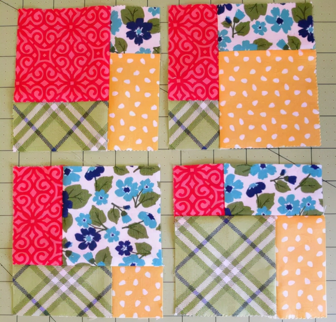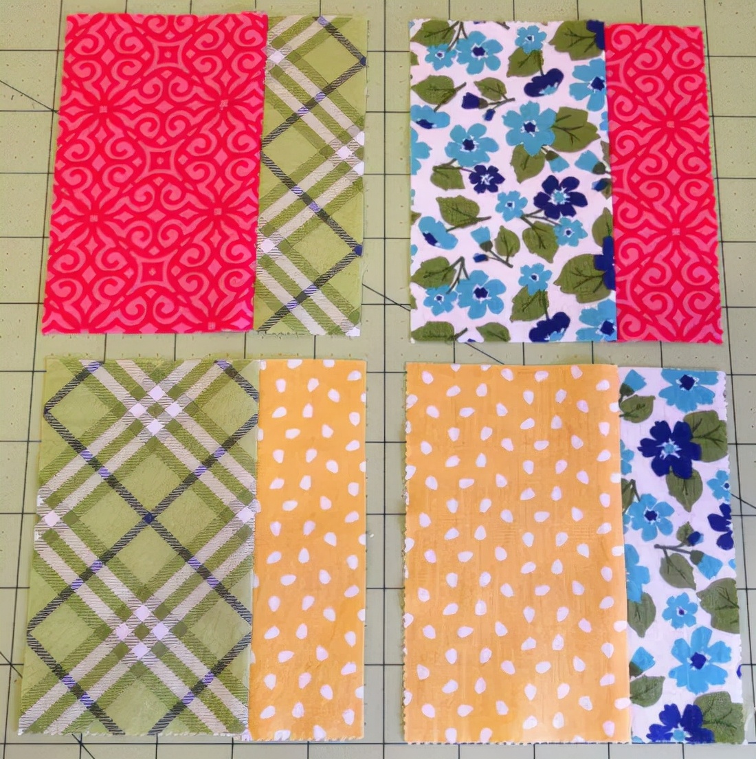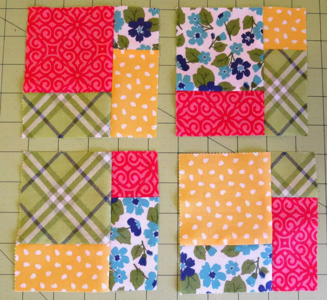 一共缝4个这样的组合,如下图所示放置,注意大方块的方向