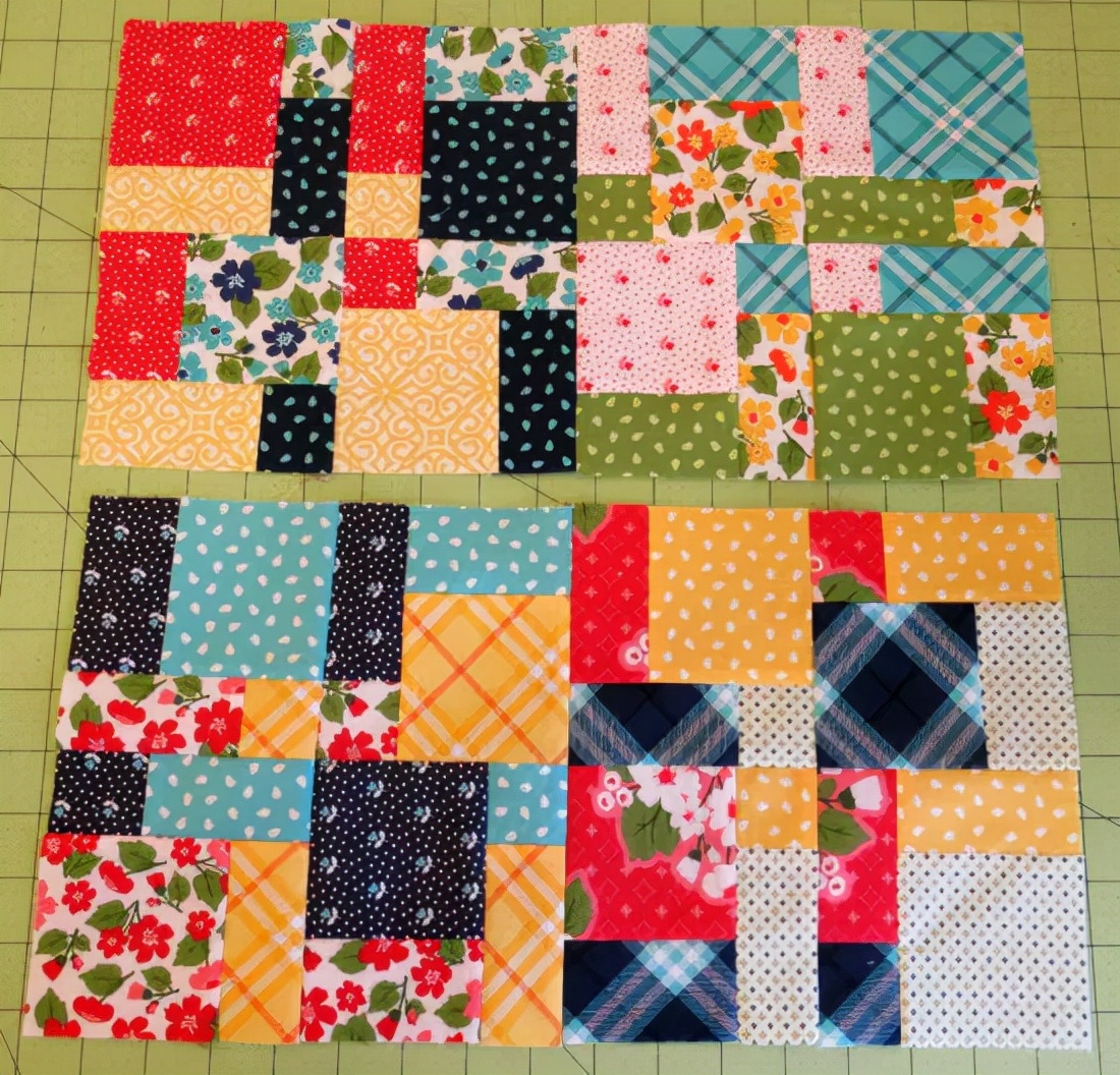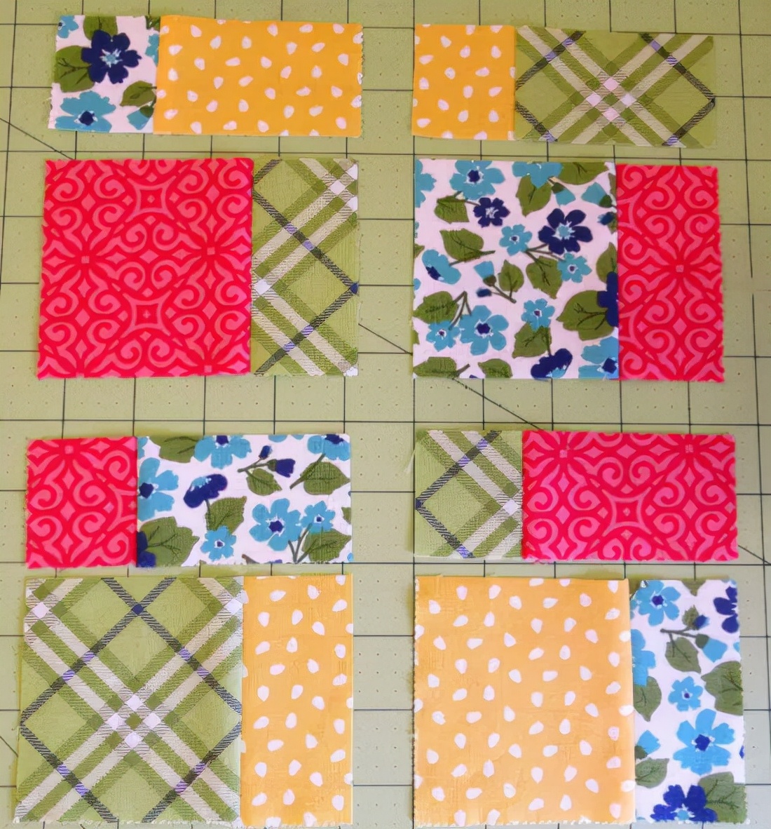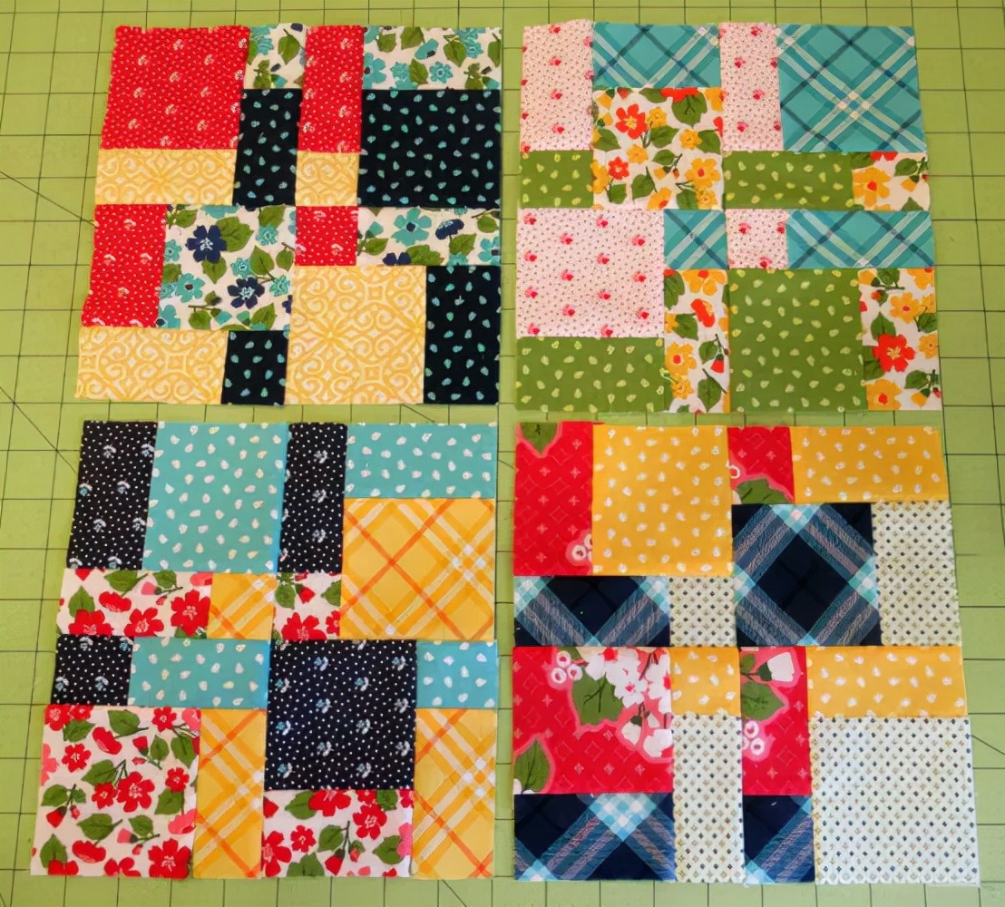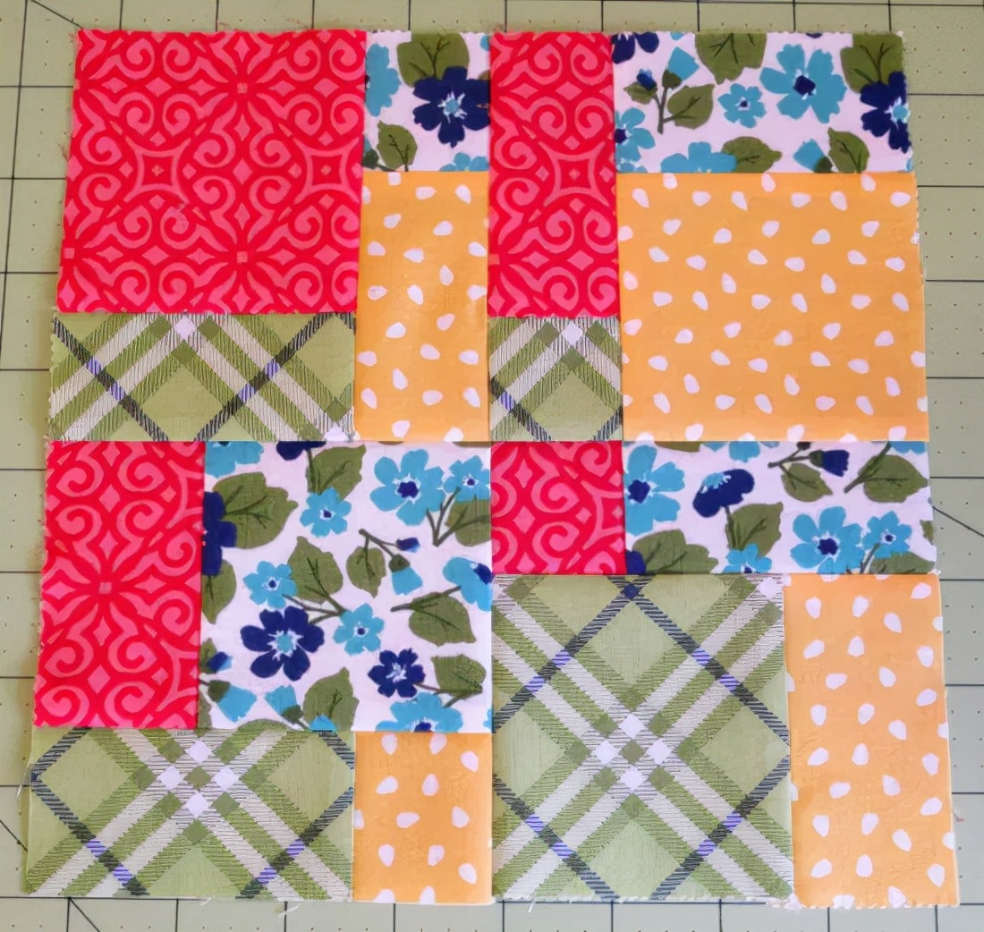 一共缝4个这样的组合,如下图所示放置,注意大方块的方向