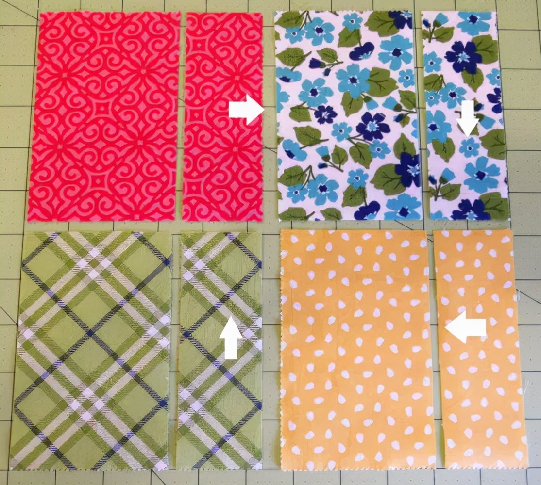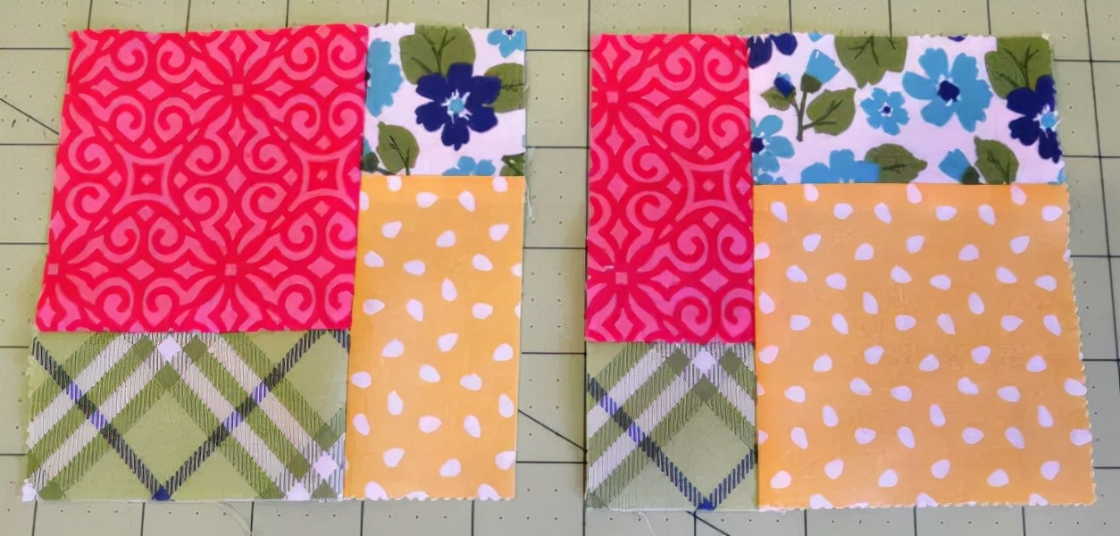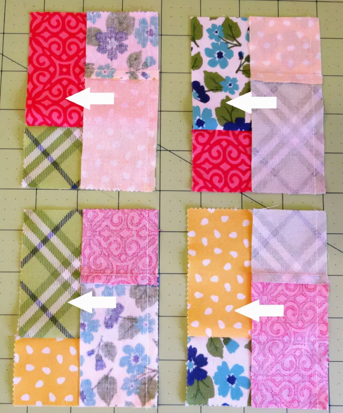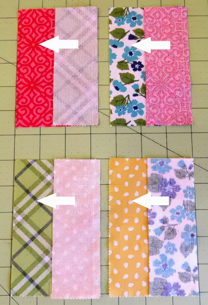 将裁下的小布条和剩下的布片分开,按照箭头分别和其他布片放在一起