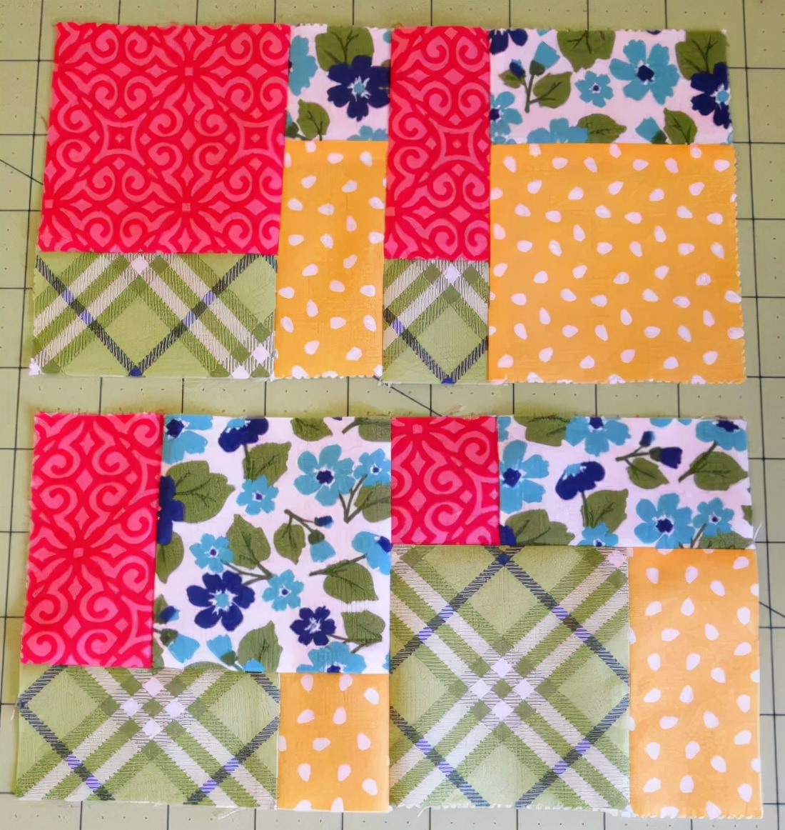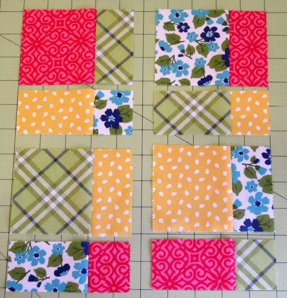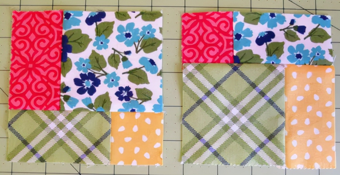 将裁下的小布条和剩下的布片分开,按照箭头分别和其他布片放在一起