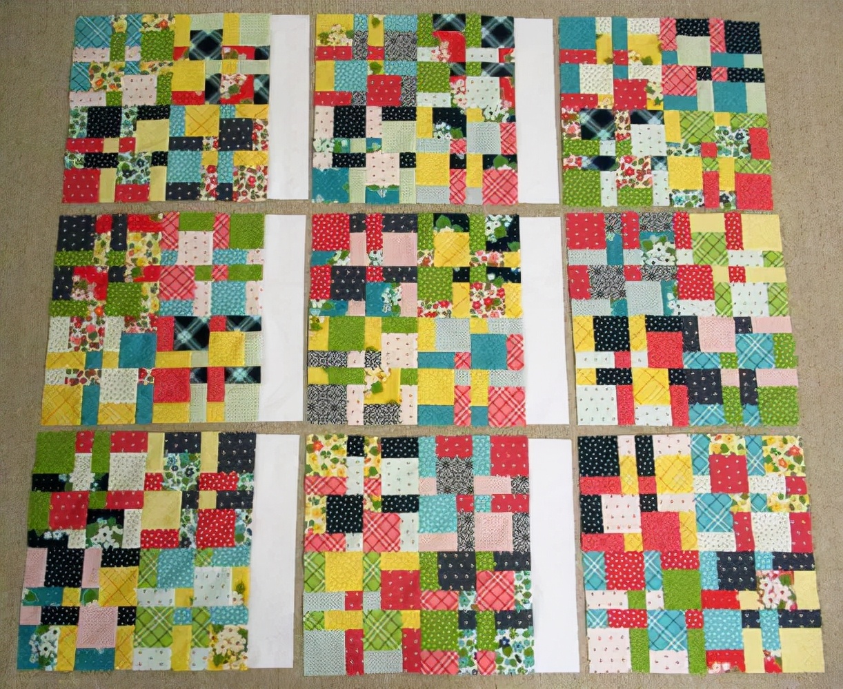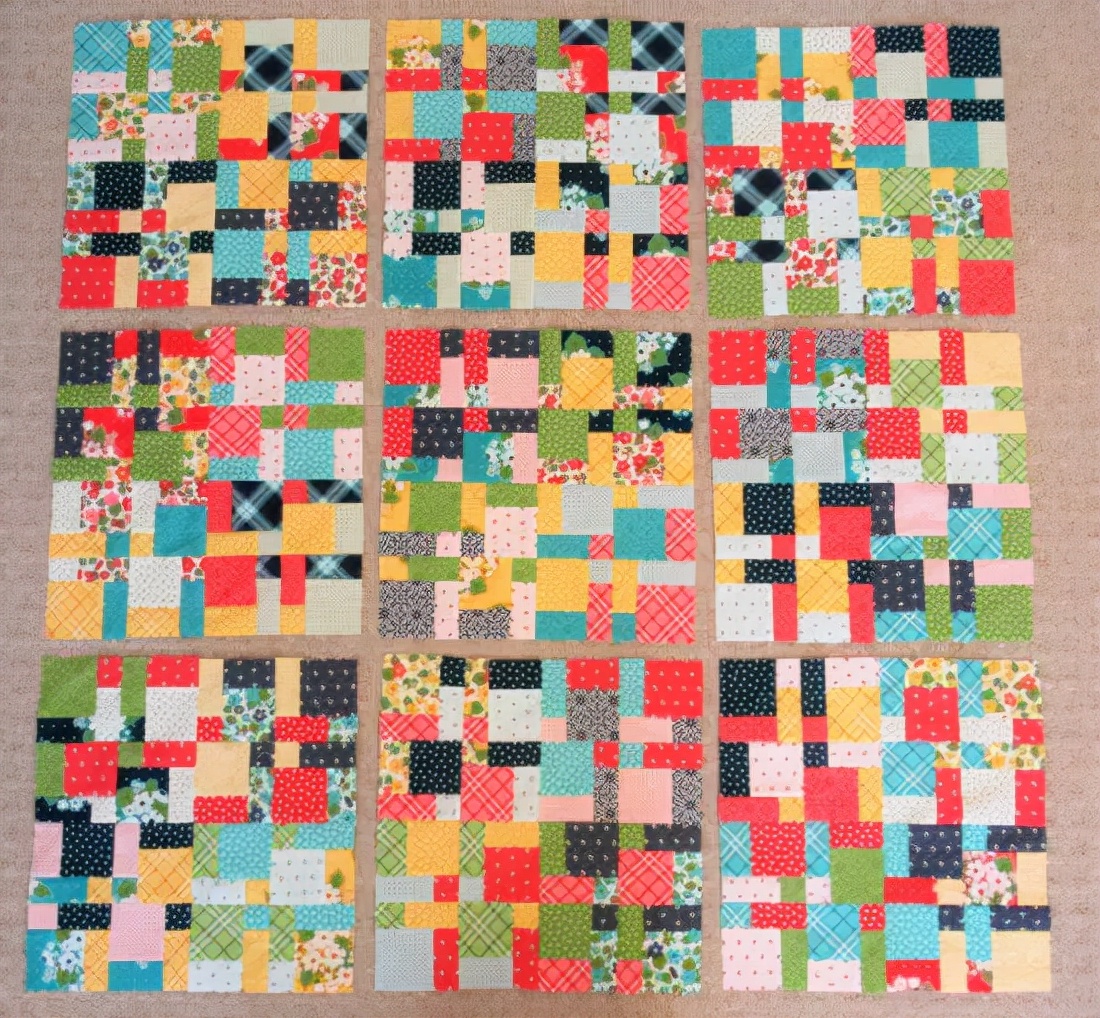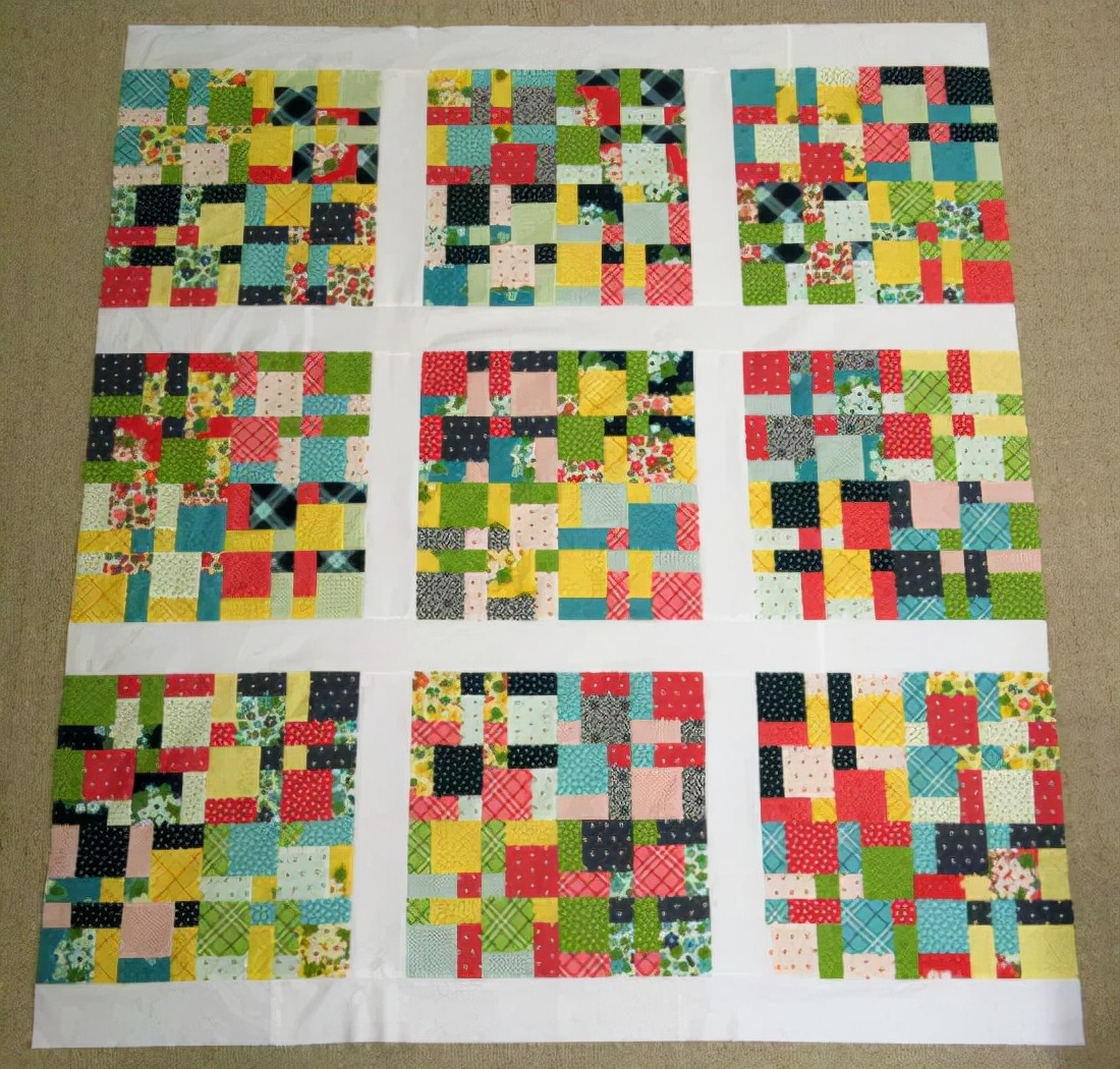 这样就是缝好的样子。注意最大的布片都在左上角。尺寸应该是4 1/2英寸正方形