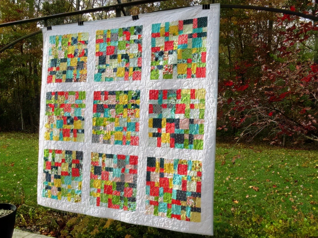 完成后看着拼布被,是不是很有感觉。这种随机又有序的感觉丝毫不感觉混乱和不适,制作的方法也相对简单,只是需要注意一下方向和排列,而且这个拼布被不涉及到三角形,都是四边形的,只要稍有拼布经验都可以试试哦!