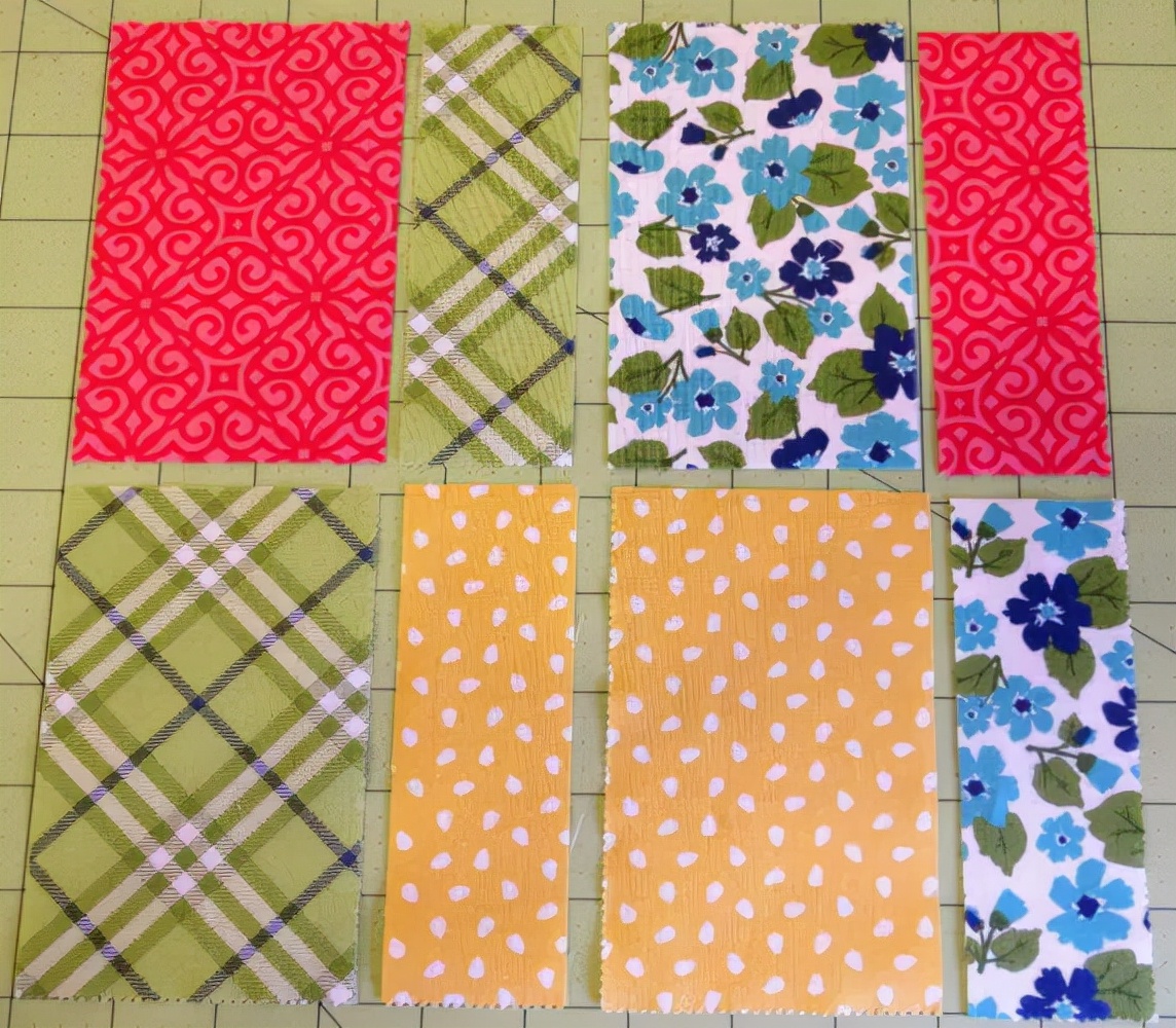每片布片裁下一条1 3/4英寸布条,这样剩下的布片应该是3 1/4*5英寸