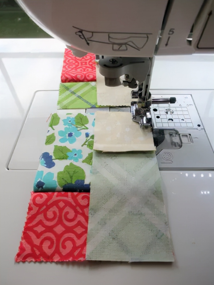边条布裁3条3 1/2英寸宽的布条,然后进一步裁成6条2 1/2*16 1/2英寸布条。拼接每一排