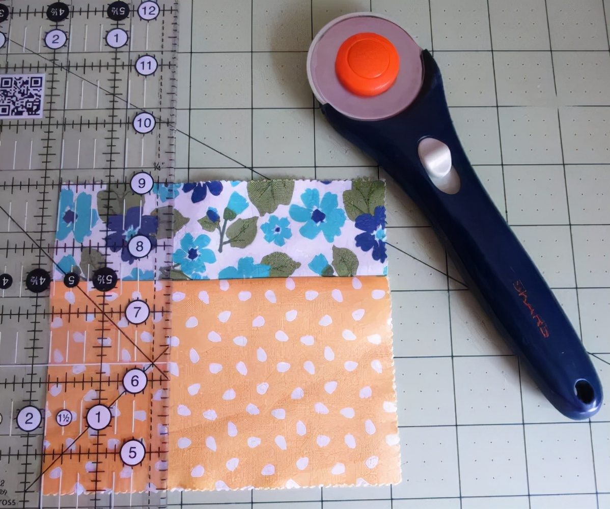 将缝好的部分转成上面小布片,下面大布片的样子,左侧裁下1 3/4英寸的布条