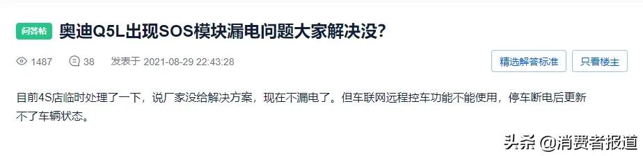 《消费者报道》在车质网、汽车之家等平台发现,不少网友反映奥迪Q5L出现因SOS模块漏电而导致电瓶亏电的问题。那么,上述问题是否奥迪Q5L车型的质量通病?奥迪方面对此又有何应对措施?《消费者报道》对此进行了采访调查。