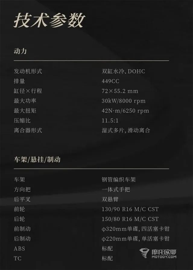 众所周知450CL-C对低扭进行了加强,虽然采用的还是春风那台270°曲轴的450cc双缸发动机,但它的最大功率只有30kw/8000rpm,比同平台车型少了7kw,最大扭矩为42nm/6250rpm,比同平台车型增大了3nm,标配滑动离合器。