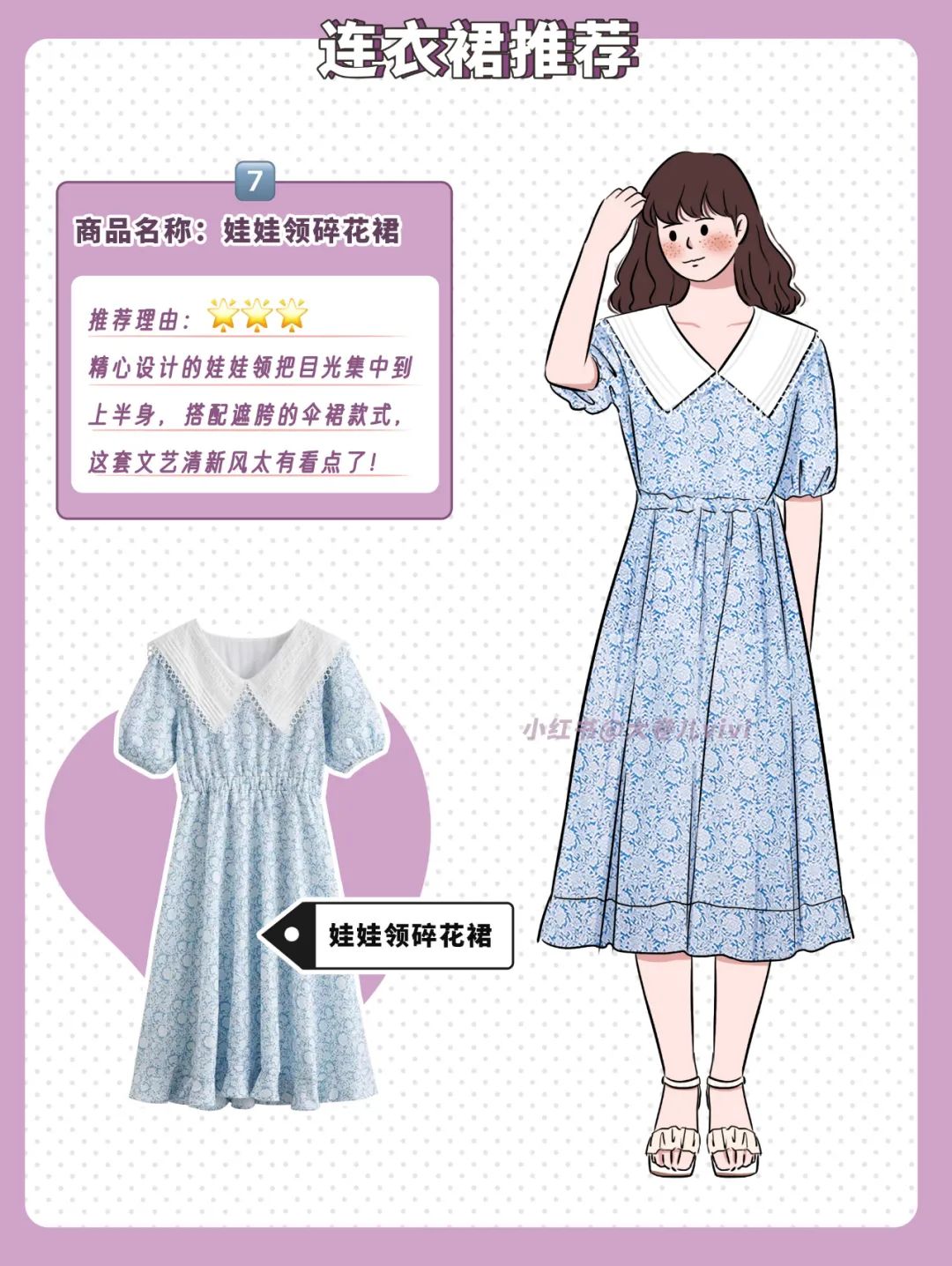 今年貌似还挺流行娃娃领的,结合法式碎花营造一种森系仙女的感觉,整体就是又甜又小清新,蓝色连衣裙可太有初恋的味道了!