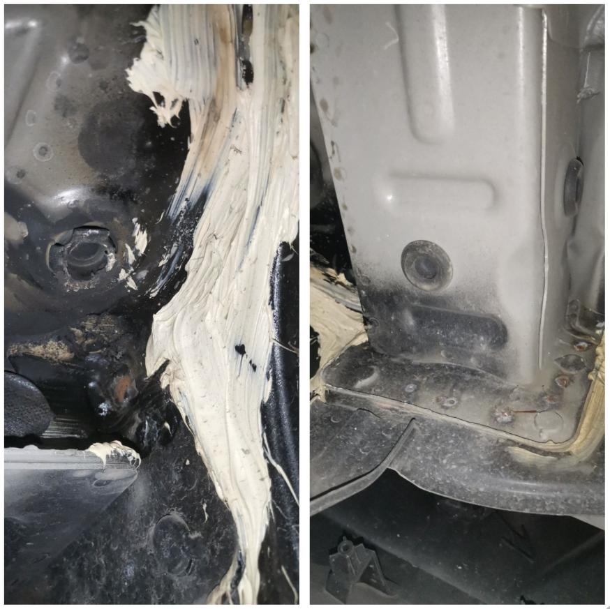 拆掉护板之后首先确认了一下前纵梁没有问题;不过元宝梁应该是托底了,磕到有一小块变形;另外底部的电池包也有刮蹭,幸好只是刮到了涂层,没有伤到电池……不然,客户就要放弃了。