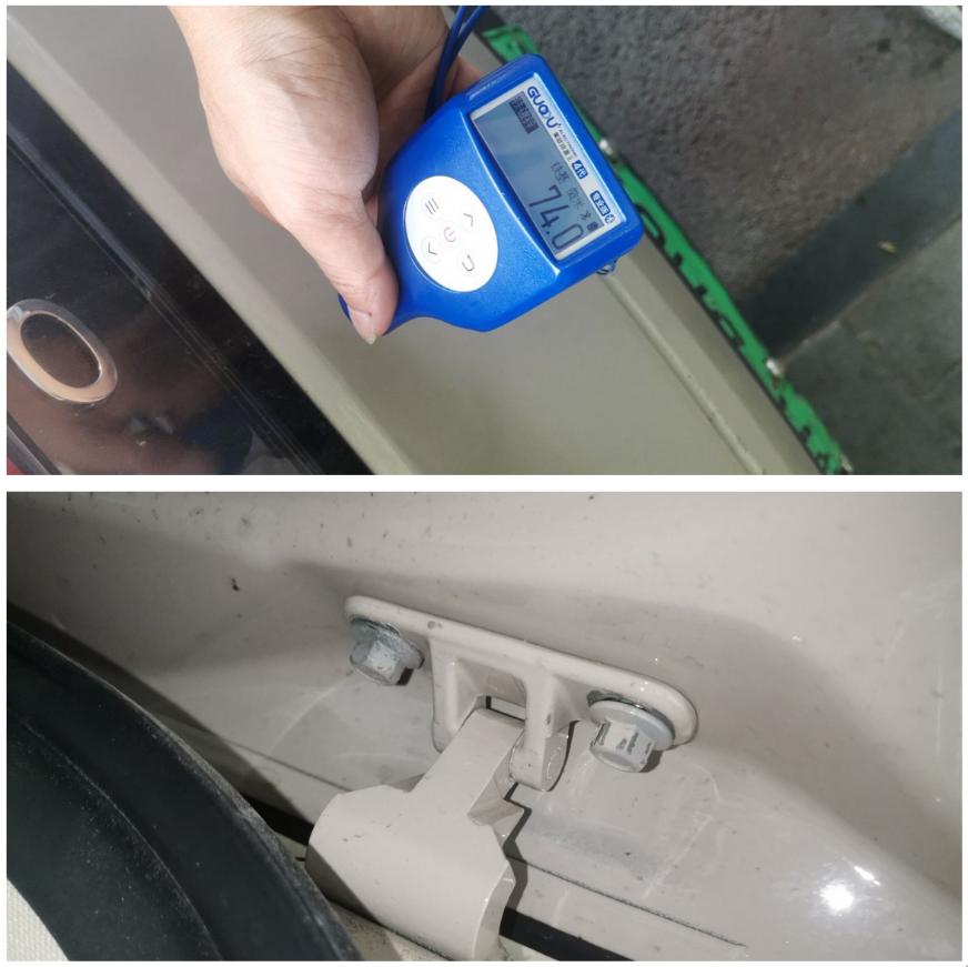 继续检查到后盖的时候,发现漆面的数值明显薄了很多,打开后尾门,检查铰链螺丝也有拆卸,那么可以确定是后尾盖是更换过的。