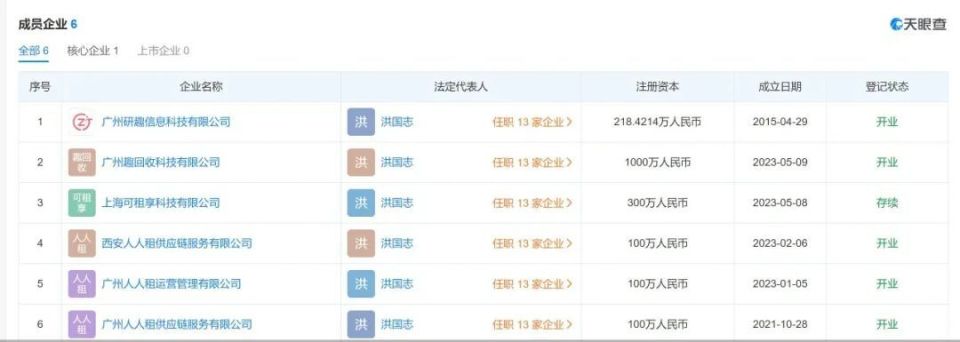 而手机租赁商的生意,也随着市场需求的扩大不断升级。据天眼查,仅“人人租”一家租赁平台,已完成5轮融资,其中两轮交易金额近亿元,背后涉及6家关联公司,广州研趣信息科技有限公司为其核心企业,6家公司涉及回收、租赁、运营推广、运输代理等业务,几乎触达手机租赁的全链条。而“优品租”平台则涉及包括宁波青年优品电子商务有限公司在内的8家公司,从事软件和信息技术服务、货币金融服务、租赁业等。