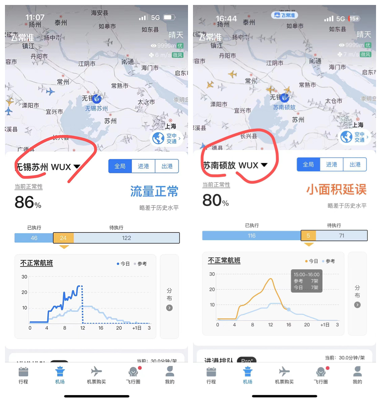 下午4点多,记者再次查询航旅纵横App发现,“无锡苏州机场”又变成了无锡硕放机场。而飞常准App上,也已恢复为苏南硕放机场。