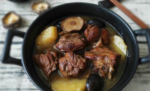 鸭肉焖香菇 原料:鸭胸肉200 克,香菇、盐、姜、蒜、料酒、老抽各适量。
