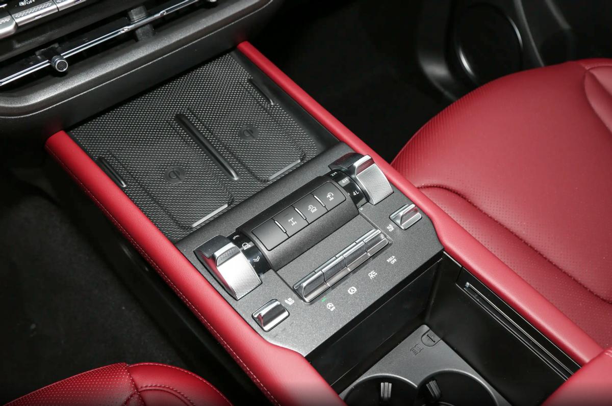 但值得给好评的是,飞机档把取消后,中控台可用位置变大,原先一个无线充电位现在变为了2个无线充电位。也保留了所有的越野功能的实体按键,并且都集中在了中控台的下方。