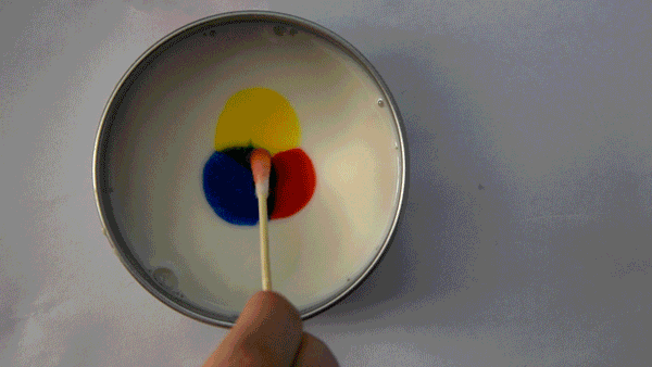 准备食用色素、实验杯、实验器皿、棉签、全脂牛奶、洗洁精。将牛奶倒入试验器皿,覆盖器皿底部。