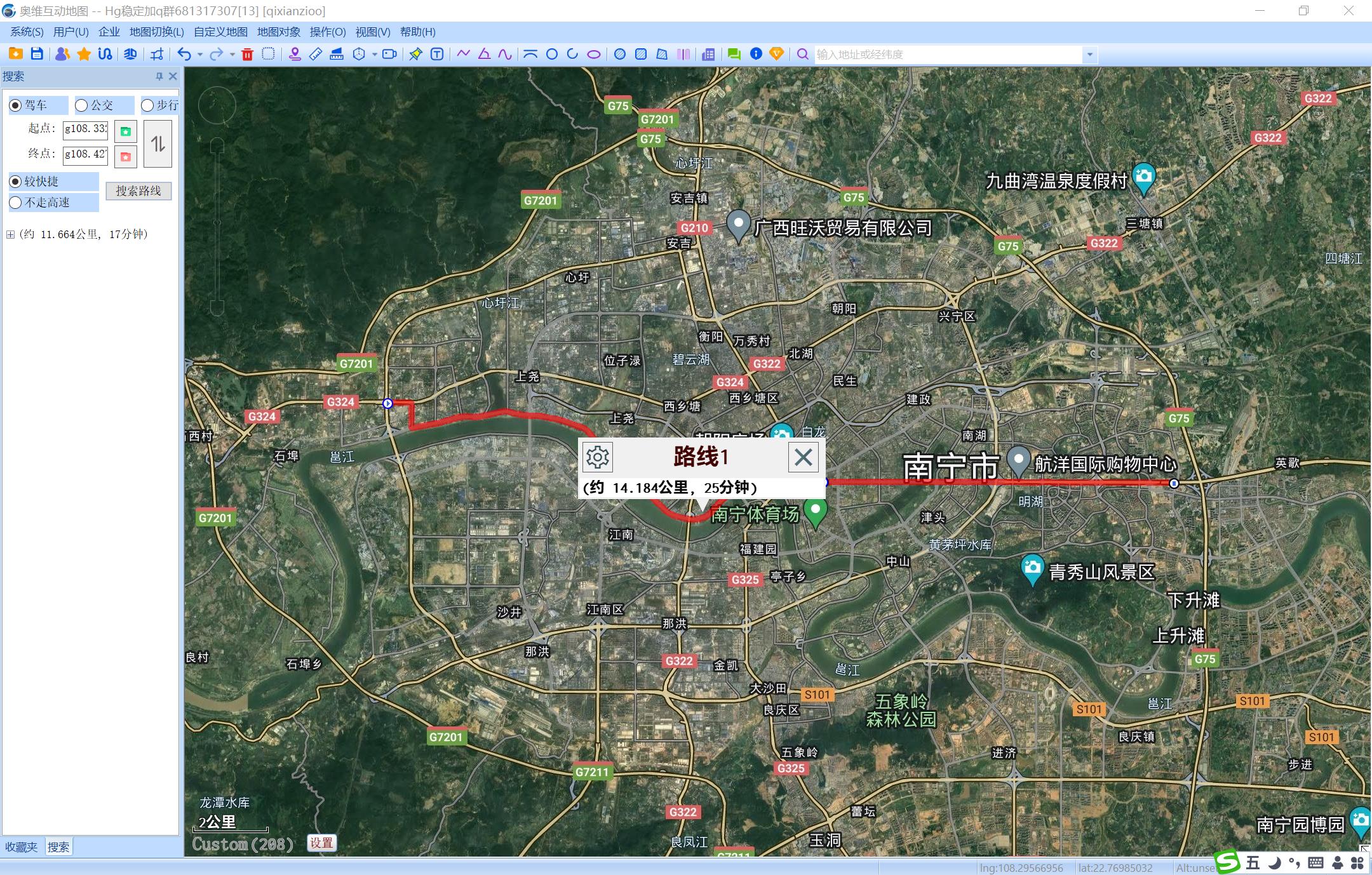 经过添加两个途经点,就形成我们想要的路线了,比上图可以看出,康定和芒康的位置有两个小圆点,那就是我们添加的途经点,要注意的是,奥维互动地图每线路线最多只可以添加8个途经点,那么如果有一条路线需要添加超过8个途经点,这种情况我们该如何操作。比如说我们要做一条从南宁出发,走丙察察进藏到拉萨,再从拉萨走阿里南线去珠峰,再继继向前过狮泉河进入新疆,然后走帕米尔高尔,从帕米尔高原往北走一段独库公路,再向西去那拉提和赛里木湖,然后再经克拉玛依去喀纳斯。这样一条路线规划只添加8个途经点是完成不了的,我们选择南宁为起点,喀纳斯为终点,这样的路线如下图
