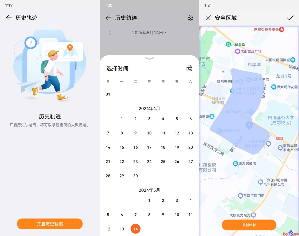 孩子大点了之后基本都是自己去上下学的,家长又没有很多的时间与孩子交流,而华为儿童手表 5 Pro内置的历史轨迹记录功能,可以全天候记录孩子行踪,让家长时刻感知孩子动态,了解孩子一天的行程;还有行为实时记录,具象化感知孩子的每一天,成长不缺席。如果还是不放心,华为儿童手表 5 Pro还支持更精准的安全围栏功能,家长还可以在智能关怀app上手绘孩子的安全区域和危险区域,孩子进、出对应区域,家长均可收到提醒。