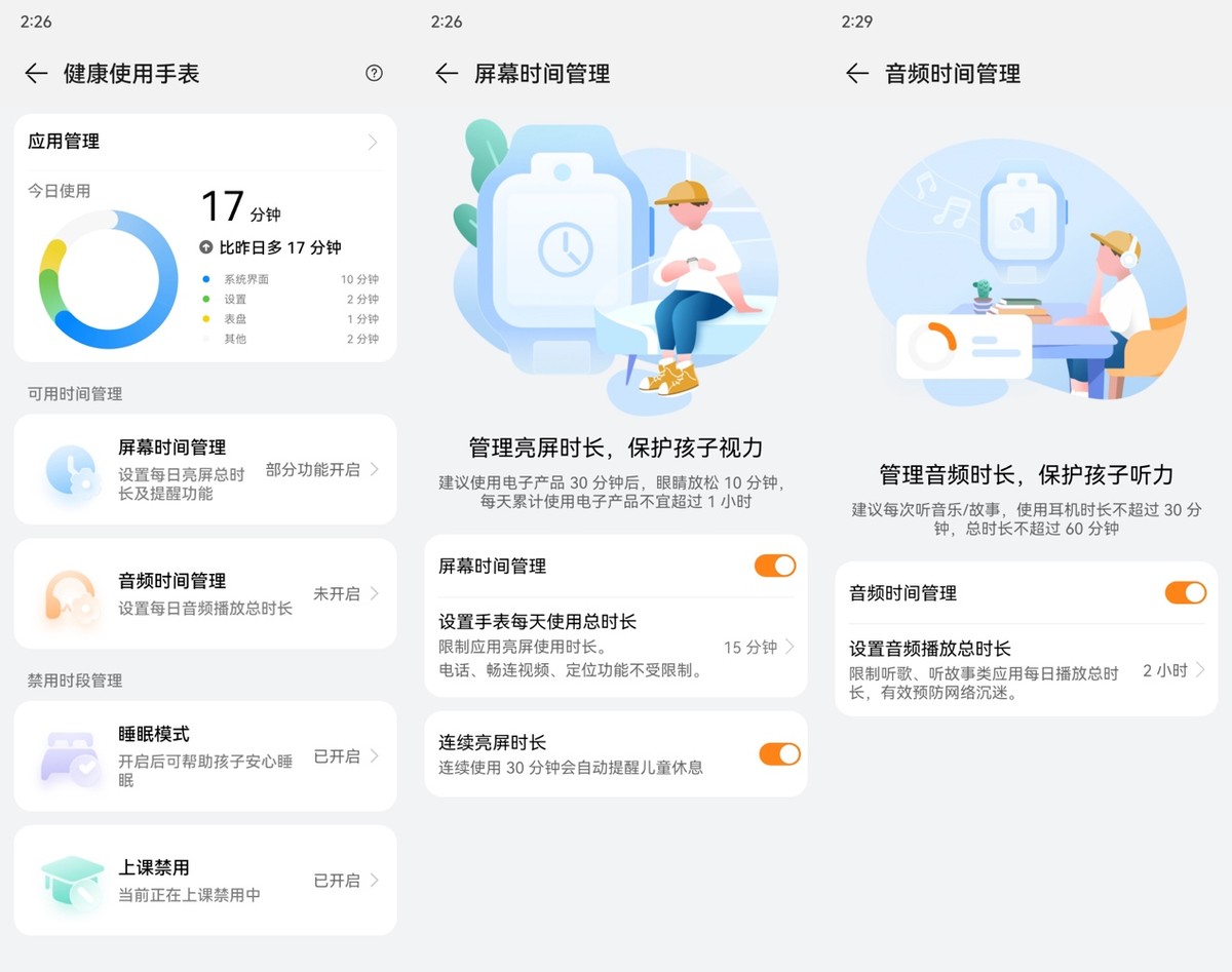 人身安全很重要,身心安全也不能放松。华为儿童手表 5 Pro支持一站式科学使用管理,家长可以对孩子进行使用时间、禁用、应用等管理。为了保护孩子视力并且防止使用沉迷,家长可以手动设置手表的亮屏使用和音频播放的时长,到期可以申请延时,而且连续亮屏30分钟后手表还会自动进入防沉迷模式,持续5分钟后才会自动退出。一开始孩子用这个功能的时候不太适应,但坚持一段时间后养成了比较好的习惯,相当实用。此外,家长还能在孩子上课期间开启禁用功能,根据应用的使用情况,对孩子行为进行精细化管理。