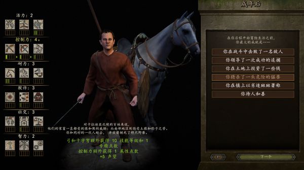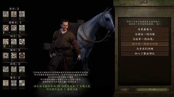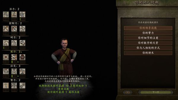 属性点加在最左边的属性上,共有6种属性:分别是活力;控制力;耐力;狡诈;社交和智力(标5),是《骑砍1》力量/敏捷/智力/魅力的拆分重组;