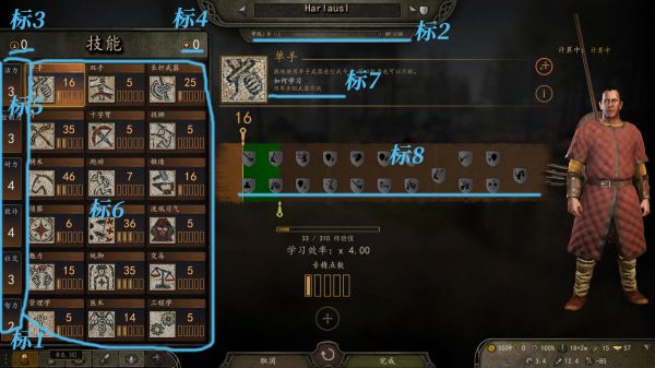 Bc.图示左边的指针代表现在的技能等级(标3),右边的指针代表技能等级上限(标4),中间的绿色的就是可升级技能的范围(标5)。