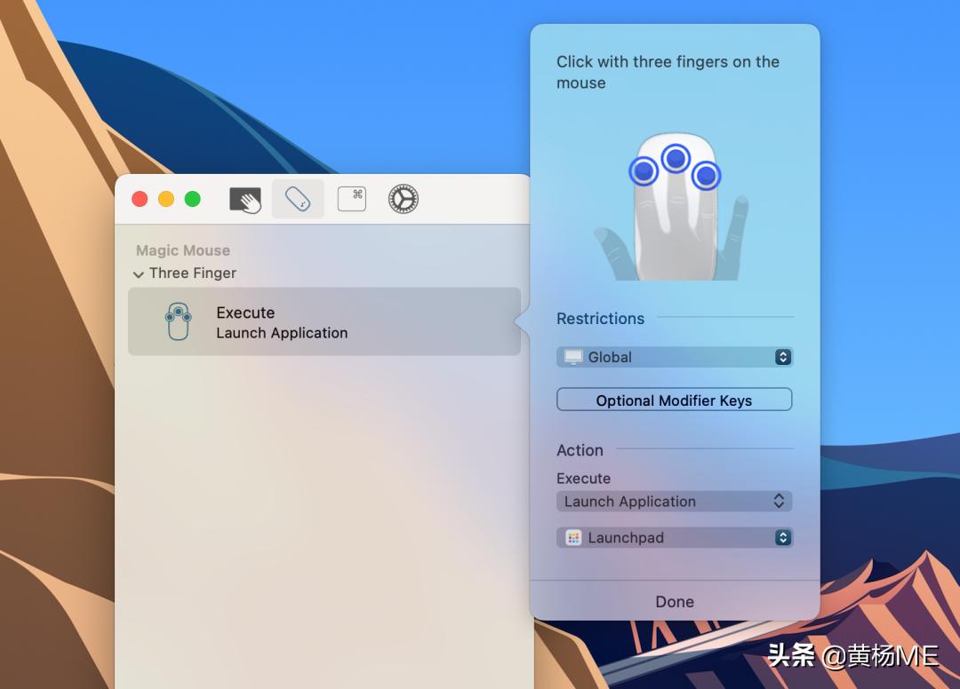 Multitouch 是一个扩展 macOS 默认妙控鼠标、触控板和快捷键的第三方工具。可以添加新手势并定义完成动作。比如我添加了一个「三指点按」就打开和关闭启动台的操作。弥补了我想要用妙控鼠标快速打开启动台的功能需要。