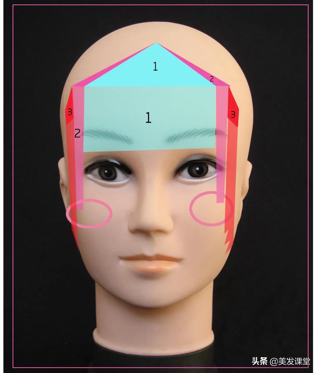刘海2区的宽度,在外眼角与额角之间,这部分的头发垂落点在颧骨位置,主要作用是修饰凸出的颧骨和调节五眼及脸宽比例。