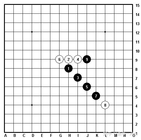 9.梅花阵:因黑方四子如梅花状而被称之为梅花阵。在传统阵法中属攻强守弱的类型。在进攻时,多以斜直相辅、连跳结合来组织攻势。变化极多。