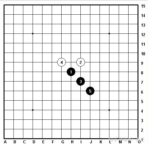 1.斜三阵:五子棋最基础的阵型。本阵还可演化成一字长蛇阵以及长勾阵。