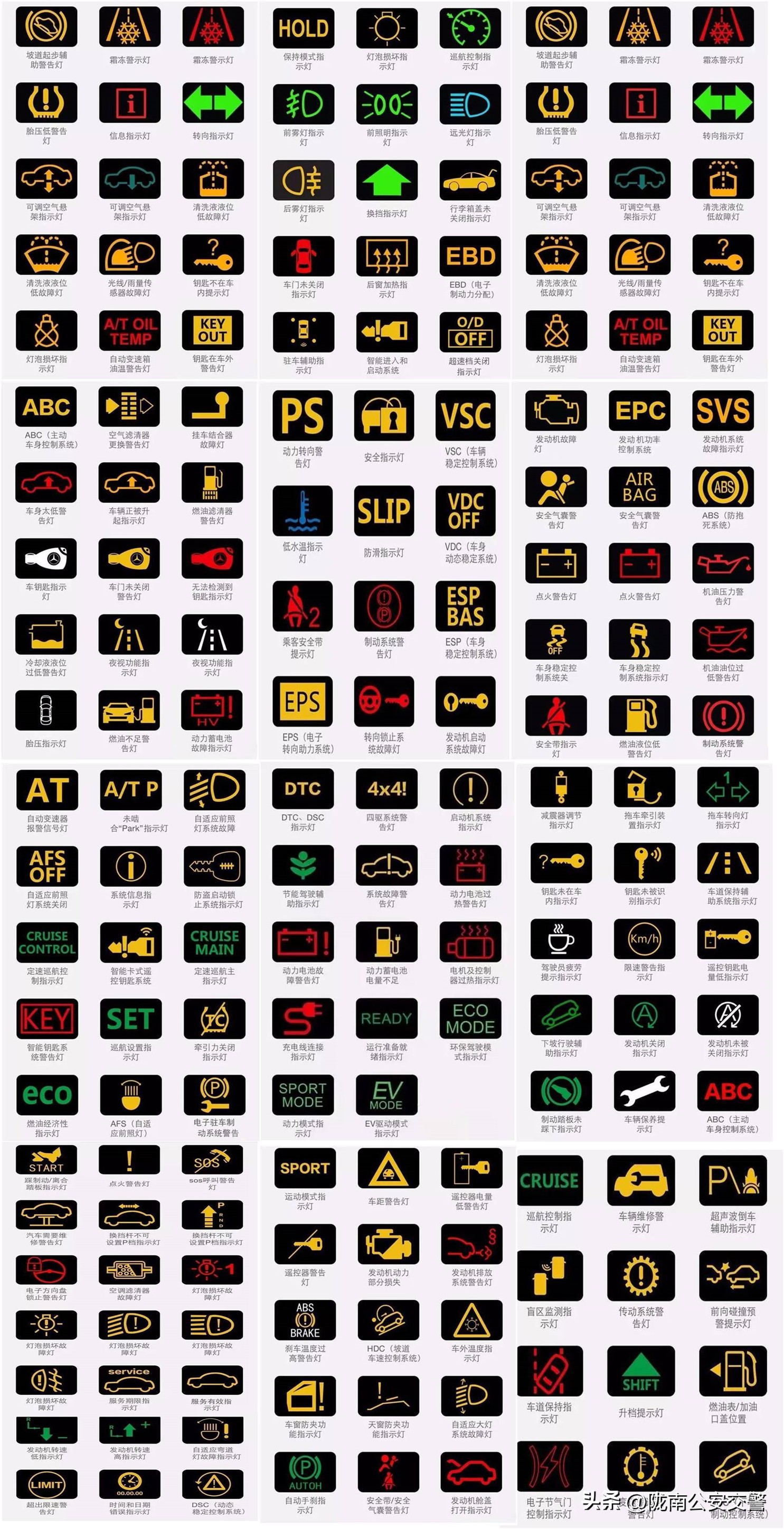 汽车指示灯种类繁多,不同指示灯代表不同功能或故障,以下为作者收集的最全故障灯图解,强烈建议点赞加收藏,以备不时之需。