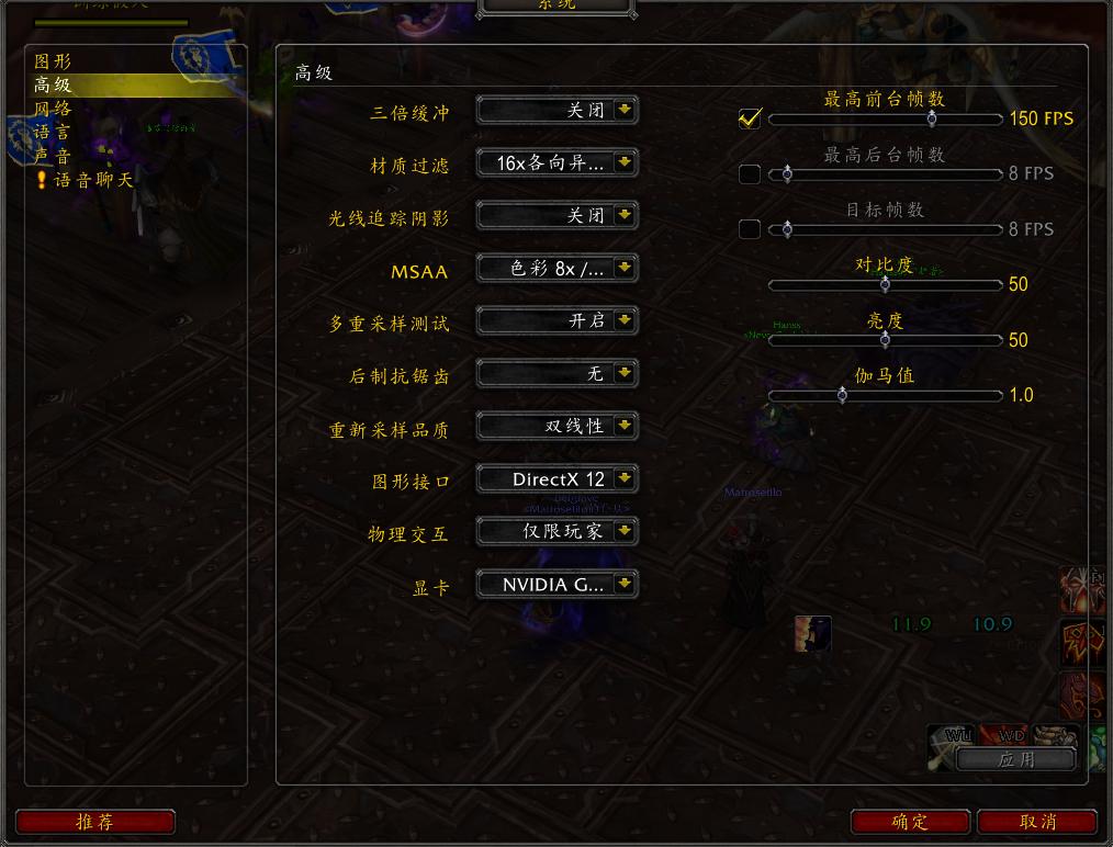 WOW画面设置分辨率采用2560*1440(2k)、图像质量直接拉满10档、抗锯齿使用Msaa 8X。