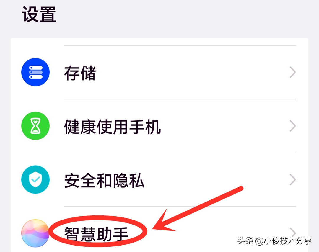 我们打开手机设置之后,往下就可以看到有一个【智慧助手】的开关,我们点击打开它