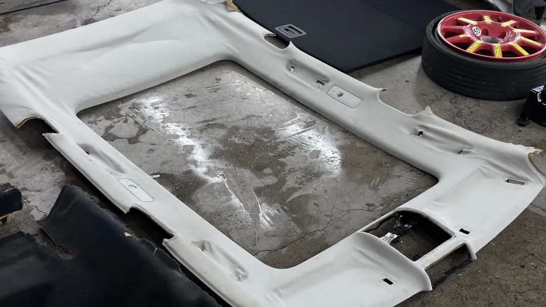 下面开始破案备胎水咋回事了,当咱们准备拆解顶棚篷布做翻新时,发现有情况,篷布里面湿哒哒的,然后咱们就怀疑天窗肯定有问题,百分百漏水了。