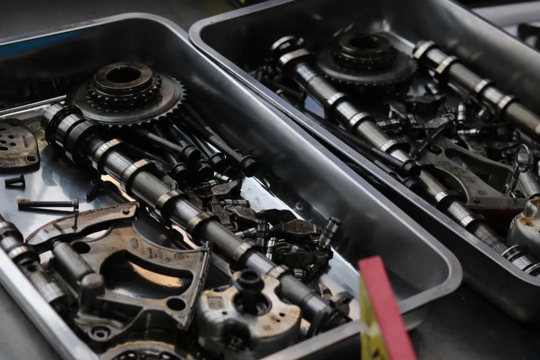 发动机彻底分解完毕,进气系统、凸轮轴、曲轴、瓦片、传动轮等等小部件。