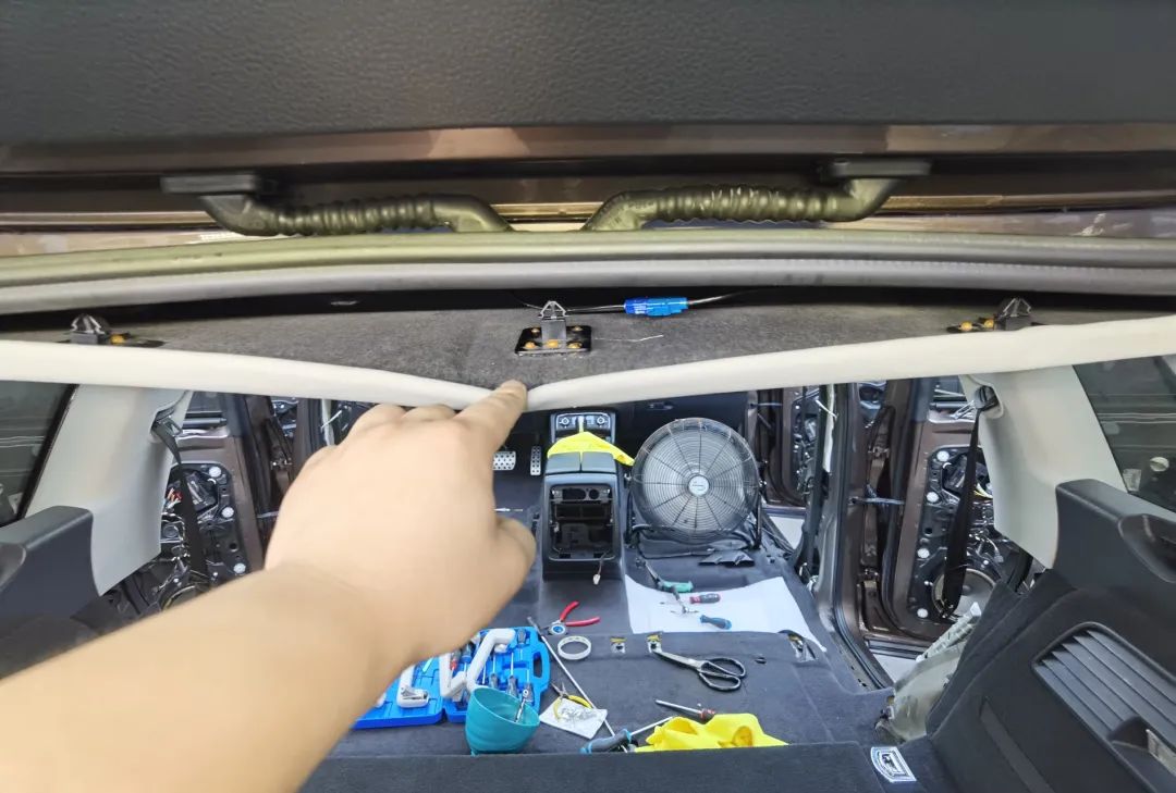 天窗回装好,然后做测试,天窗是不漏了,结果车顶行李架螺丝位置也在漏水,所以这车备胎槽水源基本破案了,整个车顶漏水,倒灌到车内顶棚,顺着车架全流到备胎槽了。