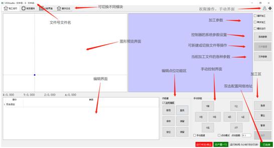 加工运行界面用来编辑加工文件、修改加工参数、选择加工程序。关于控制器的参数设置包括系统参数,文件参数,文件管理等功能都在加工运行界面中。