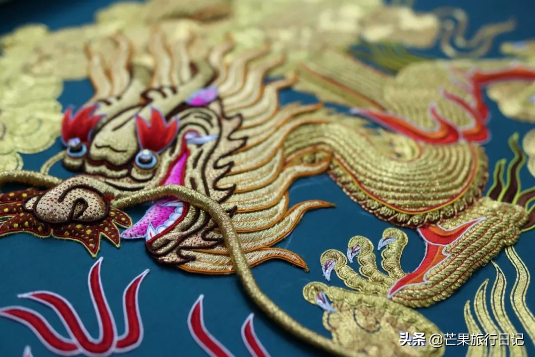 潮绣也是国家级非物质文化遗产之一,有着自己独特的地方,色彩强烈,构图饱满,针法繁多,金银线镶,具有浮雕效果,据说以前潮汕人家女儿出嫁前,母亲都会亲绣嫁衣,只是如今科技进步,机器代替人工,潮绣更多的意义是作为一种传承。