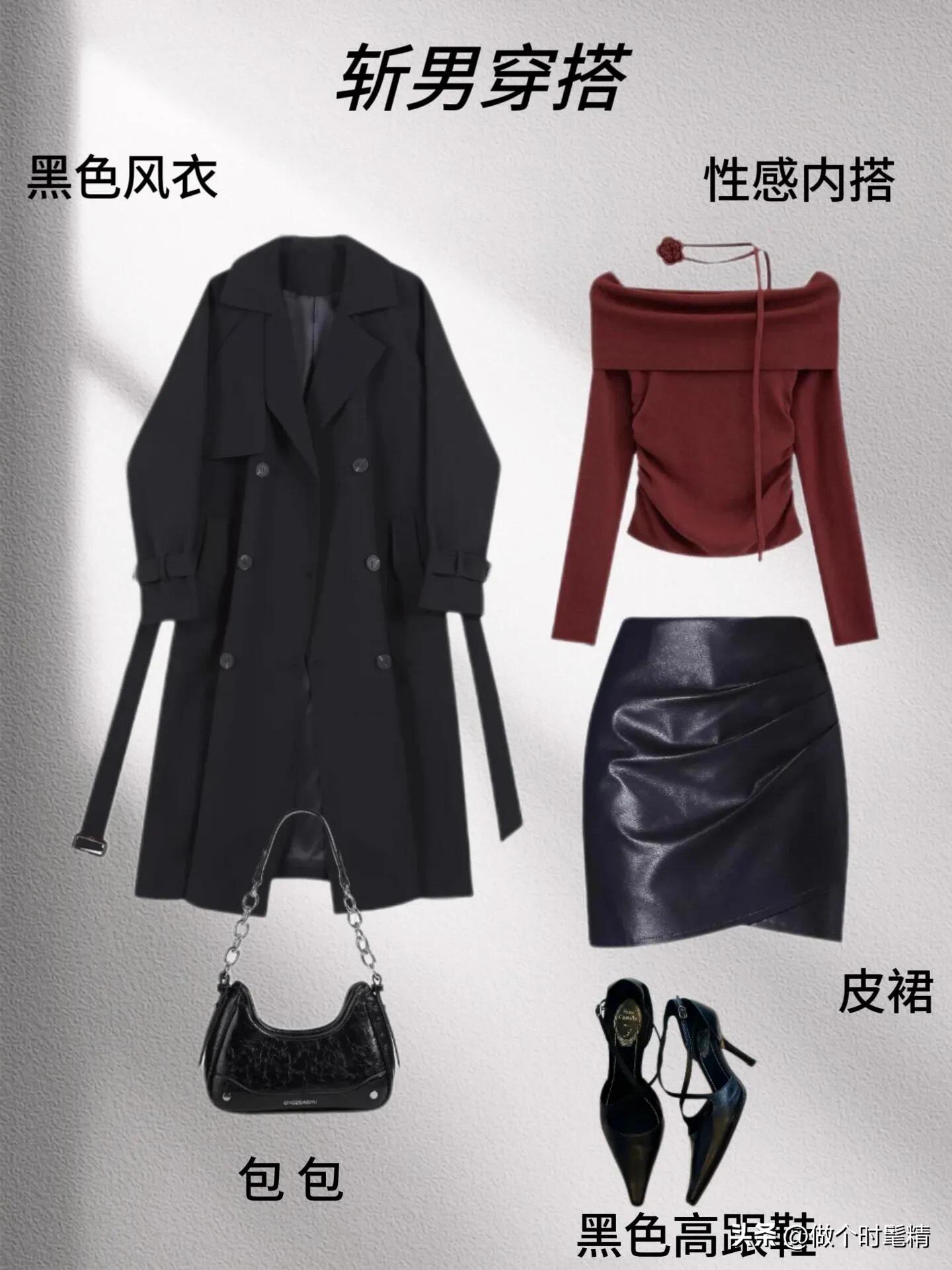 想要打造酷飒性感的风格?可以选择黑色风衣搭配性感内搭和短裙。