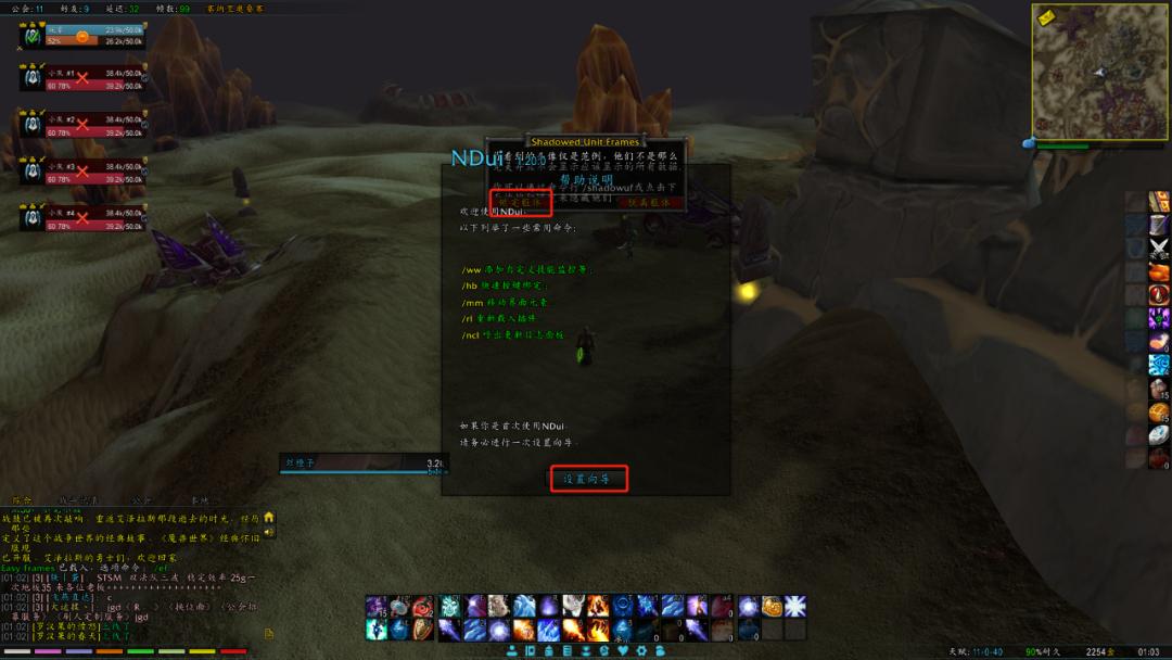 1.进入游戏以后,会提示插件过期的信息,选择全部加载,进入游戏会显示一堆,先点NDui上的设置向导,一路跳过即可,再点击ShadowUF上的锁定框体