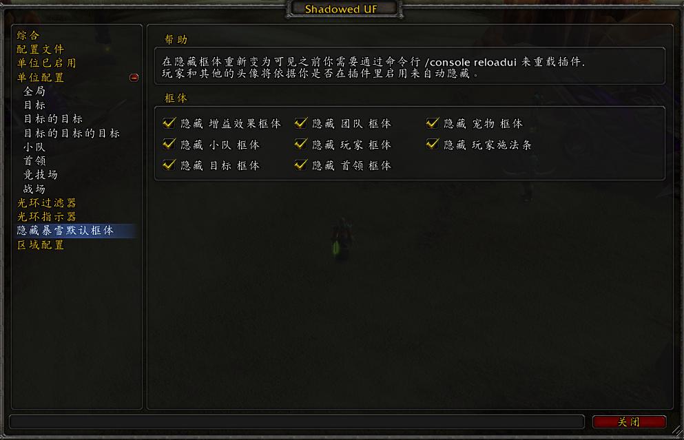 3.在聊天框中输入/suf,呼出配置ShadowedUF,将游戏自带的框体隐藏,并且隐藏施法条,全部勾选即可