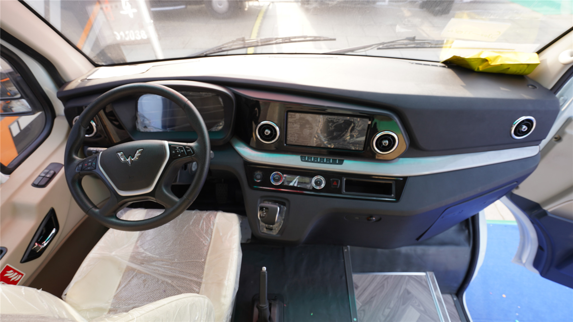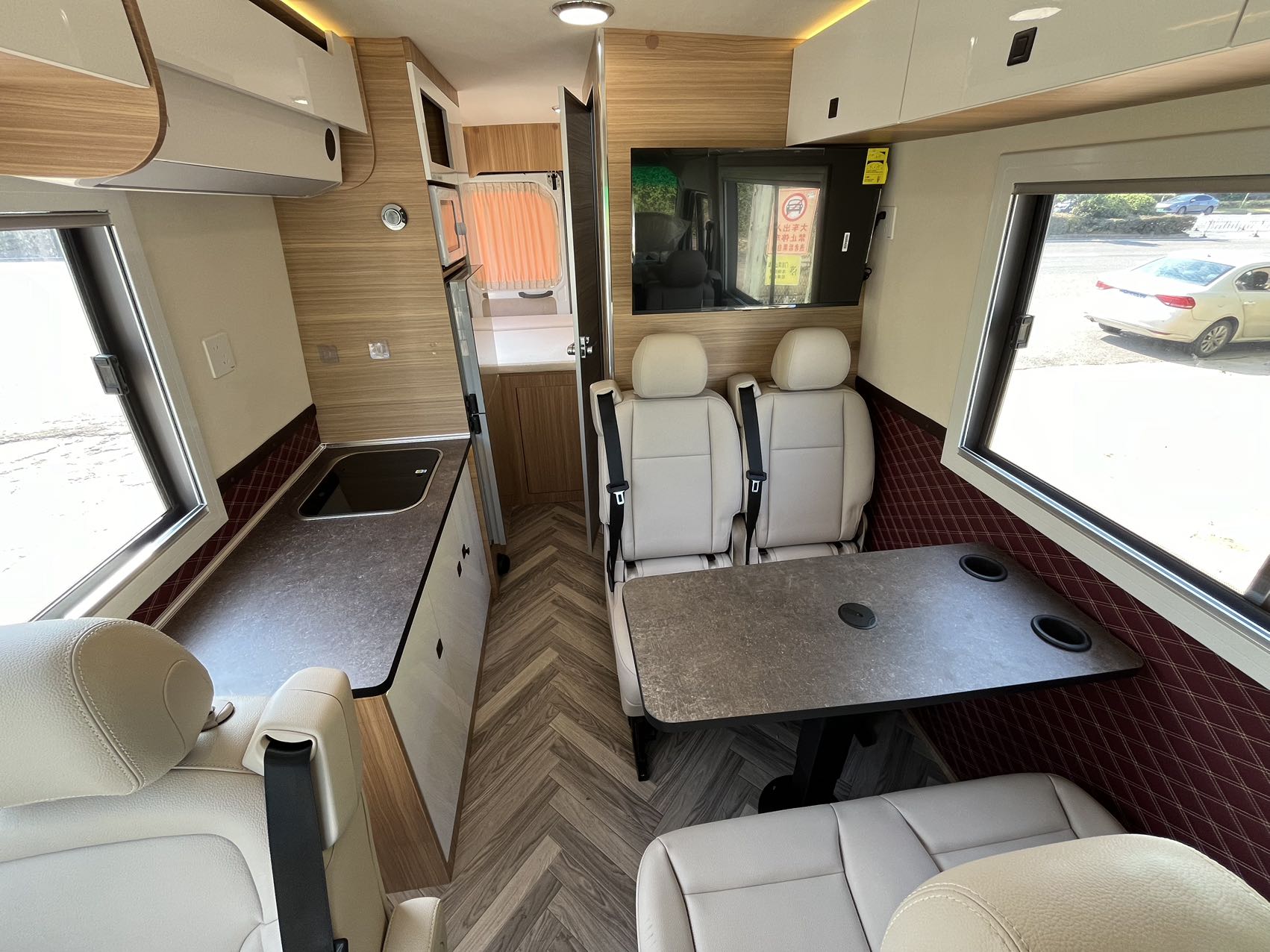 内饰设计方面,采用横床布局、车内板材颜色采用原木风格的板材。整车内部做隔音、保温处理,地面是仿木纹保温地板革,墙面防水防划高分子板,生活区玻璃覆盖遮光隐私膜和遮光防虫两用窗纱。