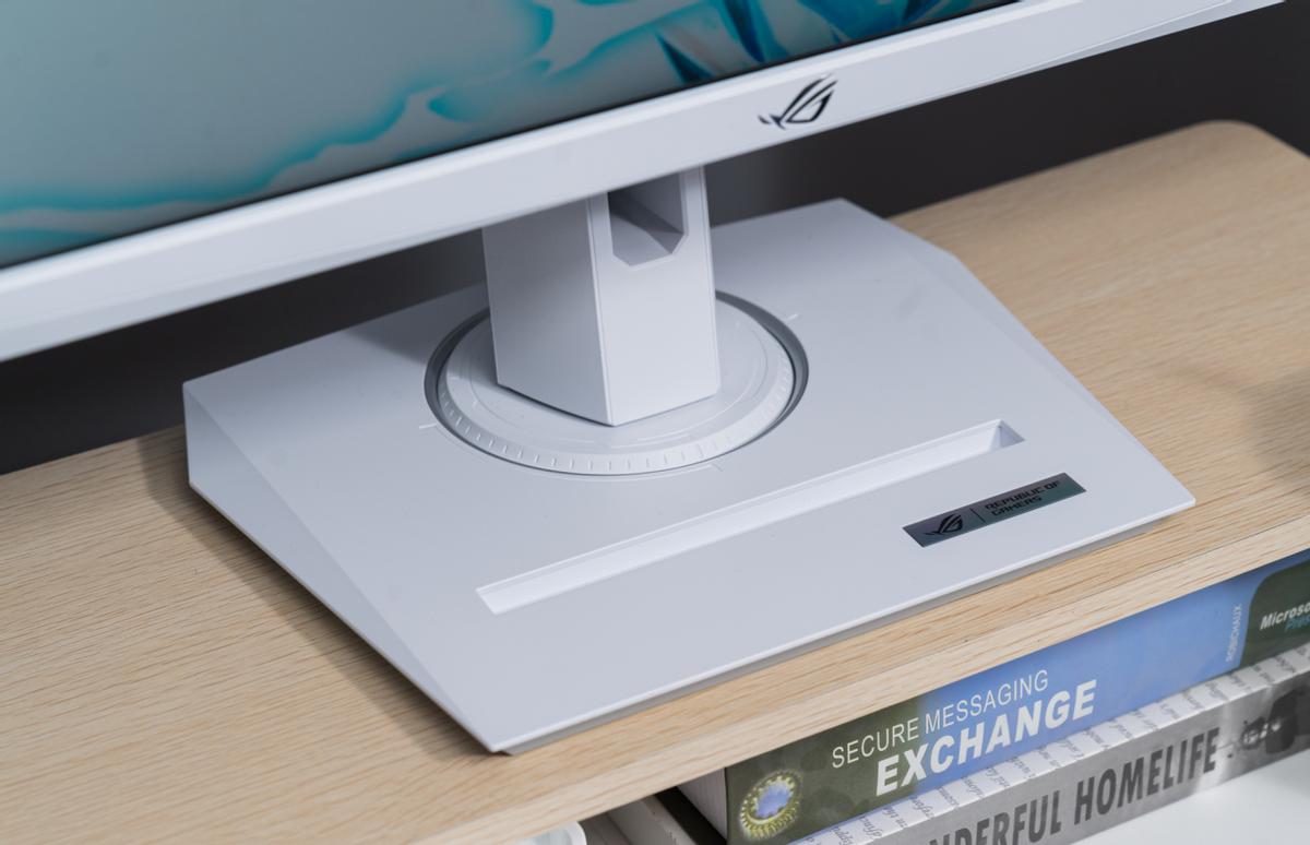 当然ROG绝杀27吹雪的支架也加入了人体工学设计,支持屏幕20°~-5°俯仰角度调节、45°~-45°水平旋转、90°~-90°垂直旋转以及0~120mm高度调节,便于用户设置到自己最为舒适的观看角度。在显示器支架顶部还配备了1/4英寸的三脚架插座,可以方便的安装摄像头或者副屏设备,进一步提高桌面的空间利用。