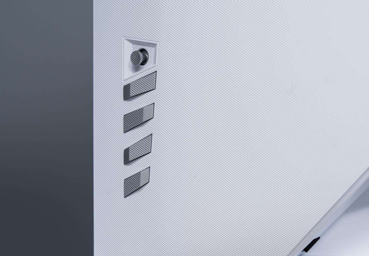ROG绝杀27吹雪的背面右侧设置了一个巨大的“ROG”败家之眼LOGO,并设置了LOGO灯,可以在OSD菜单中可以对灯光颜色、亮灯模式,当然该显示器也支持Aura Sync神光同步功能,就能让显示器的灯效和主机其他硬件的灯效实现联动,打造出整齐划一的整体灯光效果。另外背面左侧还有电竞机甲风格的图腾纹理装饰,进一步提升了整体的个性值和游戏范。