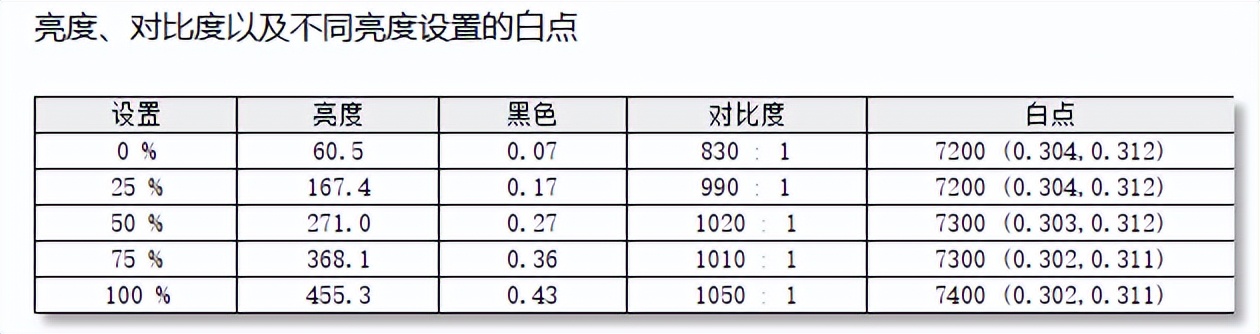 亮度、对比度方面,这款显示器的白点色温维持在7300K左右,表现还不错,最大亮度455.3cd/㎡,完全达到了VESADisplay HDR 400的要求。