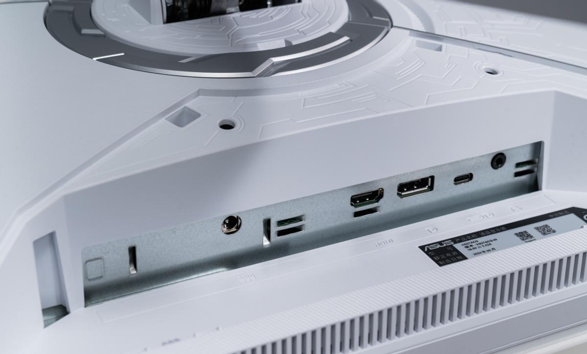 接口部分,ROG绝杀27吹雪拥有1个DP 1.4接口、1个HDMI 2.0接口、1个Type-C接口以及1个3.5mm音频输出接口,应付主流用户的日常需求毫无问题。值得一提的是,Type-C接口支持视频信号输入,大幅提升了显示器的实用性,但反向供电功率只有7.5W,连接笔记本时还需要单独供电。