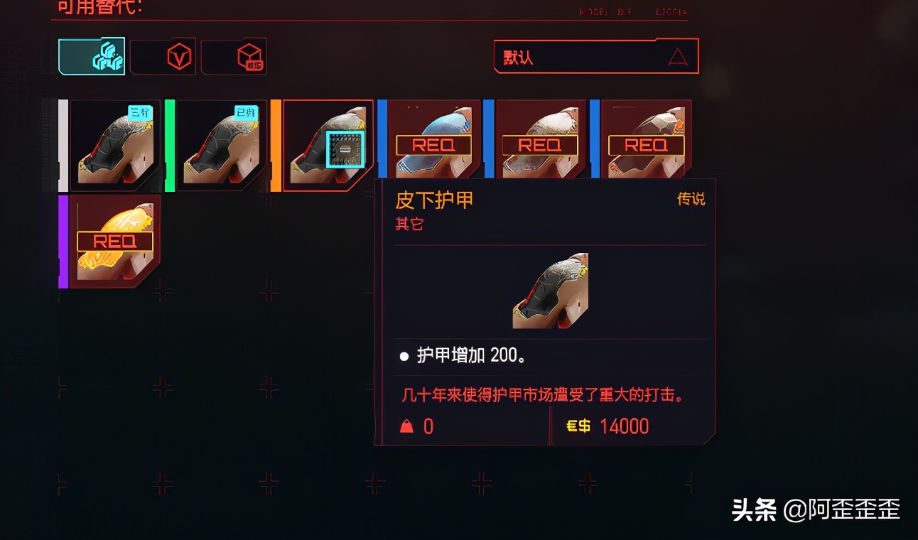 游戏中能提高玩家初期体验的义体有很多,我们先搞到一个传说皮下护甲义体,这个传说义体能够给我们提高200点护甲,售价为14000。