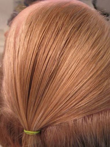 第二步:在马尾辫上方挖出一个小洞,将马尾发丝从小洞内穿过一周,其实使用拉发针做出来的造型会更加的整洁精致。